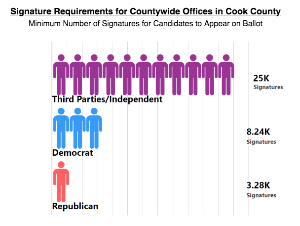 There’s also a discrepancy between signature requirements for the two majority parties and third parties in state and county elections. For example, Democratic and Republican candidates seeking a statewide office must obtain 5,000 signatures; meanwhile, independents or new-party candidates are required to muster 25,000 signatures. In Cook County, Democrats must collect 8,236 signatures and Republicans 3,282 signatures when running for countywide office. For independent and new-party candidates, the threshold is 25,000 signatures.