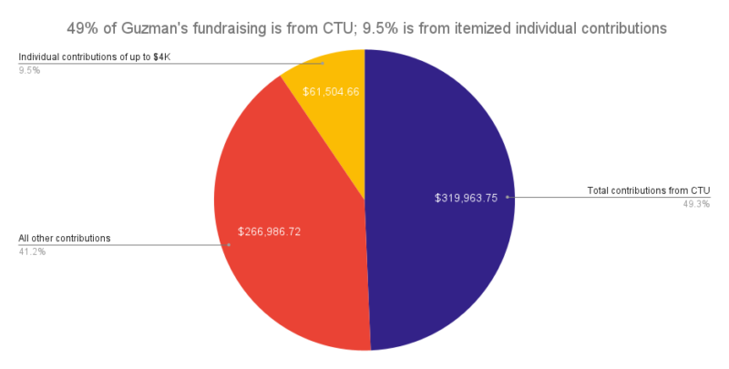 The other 50.6% of Guzman’s total fundraising comes from various sources. Her next largest overall donors are the Grassroots Political Action Committee ($86K) and the Illinois Federation of Teachers COPE ($68K). Guzman’s support from individual contributors is also worth noting: she’s raised more than $61K from individuals making contributions of up to $4K, with the average contribution being $379. These itemized individual contributions represent 9.5% of Guzman’s overall fundraising.