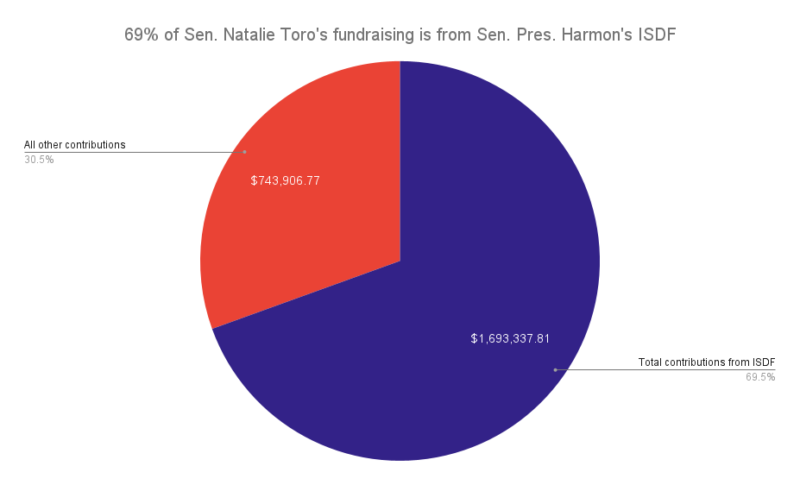 In the eight months since now-incumbent state Senator Natalie Toro was appointed to the 20th District seat after Sen. Cristina Pacione-Zayas joined Mayor Johnson’s administration, her campaign has raised a staggering $2.4 million to support her reelection bid. Most of that cash – just shy of $1.7 million of it – comes from the party committee controlled by Senate President Don Harmon, ISDF.