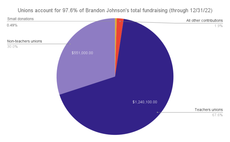Unions remain Johnson’s strongest supporters in 2023, having transferred more than $1.1 million to his campaign in January and February. Johnson’s largest contributions this year include $490K in transfers from the Chicago Teachers Union PAC and a $400K transfer from the American Federation of Teachers COPE.