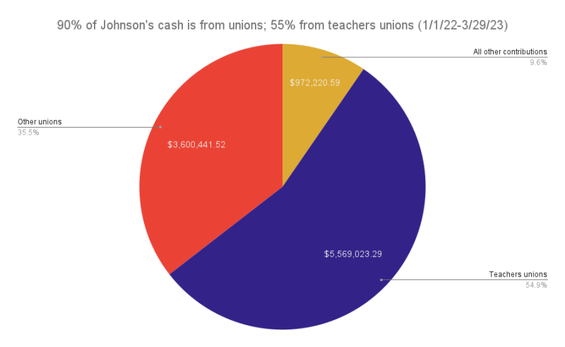 • The trends we identified in our February analysis are still holding strong. Almost all of Johnson’s campaign cash comes from unions — especially teachers unions — while megadonations from wealthy individuals and the finance sector make up the majority of Vallas’s fundraising.