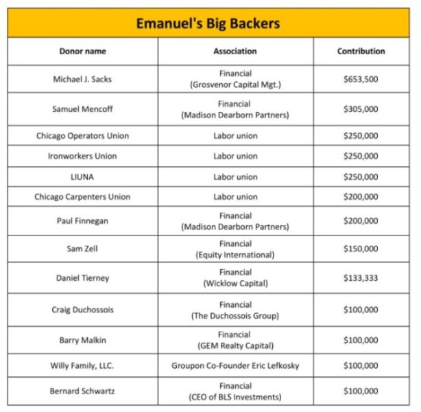 Among Emanuel’s biggest contributors were investment firm magnates, including Michael Sacks of GCM Grosvenor (contributed $653,500), Sam Zell of Equity International ($150,000), Samuel Mencoff ($305,000) and Paul Finnegan ($200,000) of Madison Dearborn Partners, and Daniel Tierney of Wicklow Capital ($133,333). Barry Malkin, the Willy Family, Inc., and Bernard Schwartz have also each given $100,000 to his campaign.