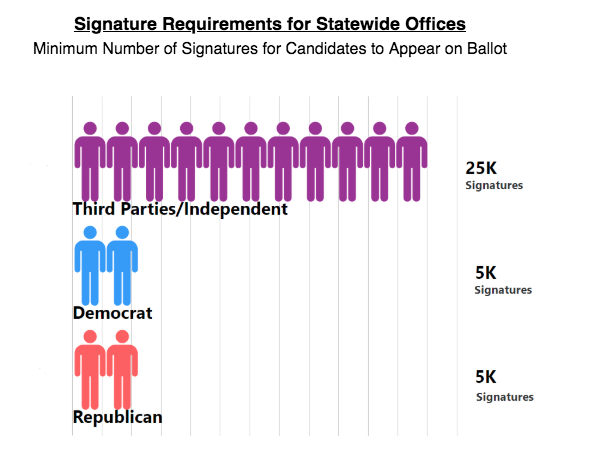 Compared to some other states, Illinois is dramatically different. In New York statewide elections, the same number of petition signatures, 15,000, are required for Democrats, Republicans, and Independents candidates, according to the New York State Board of Elections.