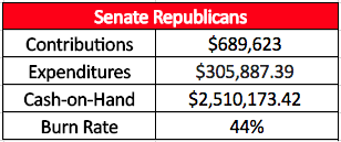 When comparing the two parties, Democrats slightly outraised Republicans, $858,866 to $689,623, respectively. However, the GOP’s $305,887 in expenditures was less than half of the Democrats $749,123 this quarter. Despite Democrats spending at a higher rate, both parties are relatively even going into the third fundraising quarter. Democrats had $2.4 million on hand and Republicans had $2.5 million on hand.
