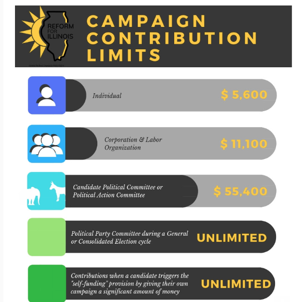 Illinois campaign finance law provides that when a candidate or Super PAC puts a significant amount of their money into a race, all contribution limits are lifted in that race. That number is $100,000 for state legislative candidates and $250,000 for statewide candidates. The rule is meant to level the playing field for non-wealthy candidates, who would otherwise be restricted to collecting $5,600 crumbs from individual donors while their self-funded opponents poured unlimited amounts into their own campaign accounts.