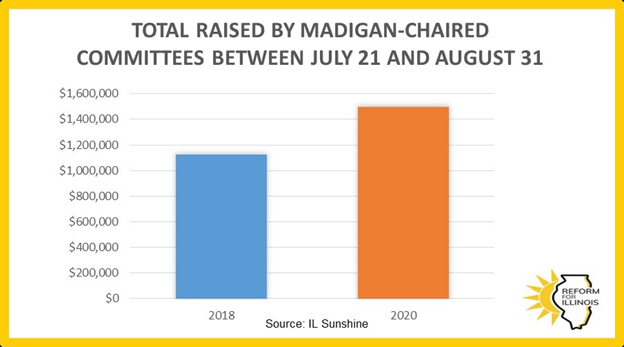 The chart below compares the contributions received by the four Madigan-chaired committees from July 21 (a few days after the release of the deferred prosecution agreement) through August 31. This year, the committees have raised more than they did over the same period in 2018.