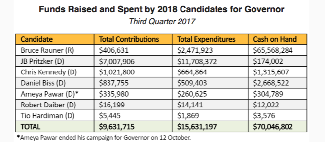As Illinois’ many 2018 races for the state’s top offices are reaching a boil, candidates are continuing to raise and spend mind-boggling amounts of money in their pursuit of victory. Chicago Alderman and Gubernatorial candidate Ameya Pawar dropped out of the race for Governor last week, citing a lack of funds. Spending reports from gubernatorial candidates in the third quarter, topping $15 million, certainly drive that point home.