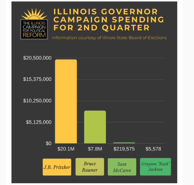 Democratic Candidate J.B. Pritzker outspent incumbent Gov. Bruce Rauner by nearly 3 to 1, $20.1 million to $7.8 million, respectively.