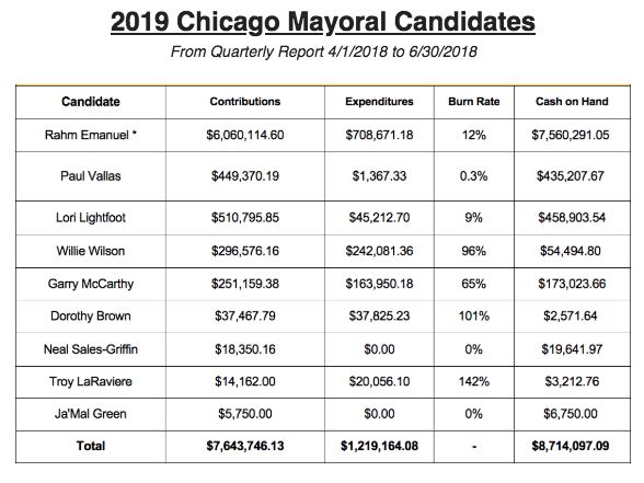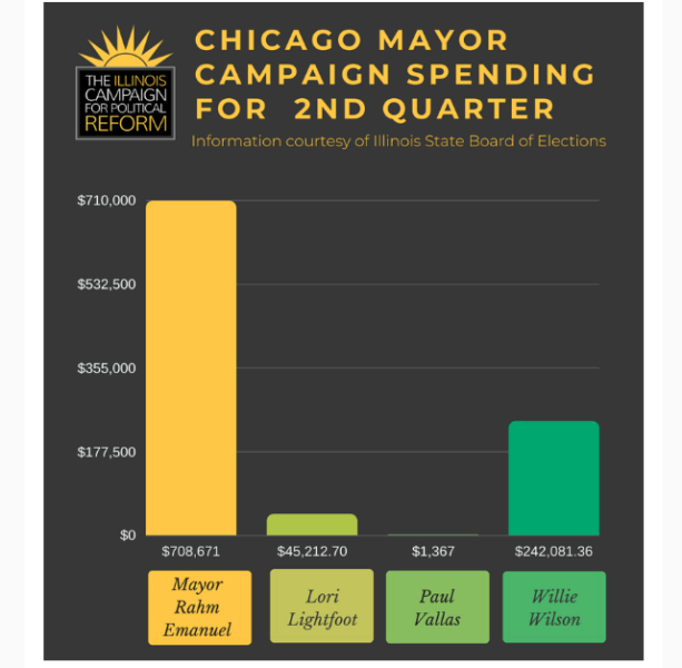 In Chicago’s packed field of mayoral candidates, incumbent Rahm Emanuel remains the clear fundraising and spending leader. The two-term mayor spent $708,671, 1.4 times all his challengers combined. He also raised more than $6 million, which is 79 percent of the $7.6 million raised among all the candidates this quarter. Emanuel reported having more than $7.5 million on hand when the quarter closed June 30.