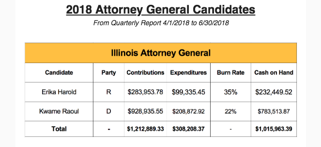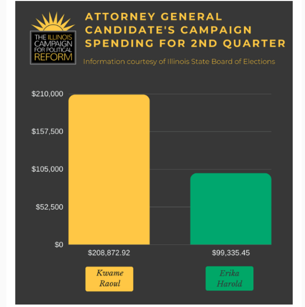 Democrat State Sen. Kwame Raoul led his Republican opponent in all factors in this fundraising quarter and raised $928,935, spent $208,873, and has $783,514 on hand. Erika Harold, an attorney for Meyer Capel in Champaign, raised $283,954, slightly more than a third of Raoul. She also spent less than half of Raoul, $99,335, and has $232,450 remaining in her campaign account, about 30 percent of the Chicago Democrat.