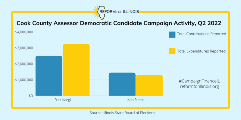 Kaegi ultimately beat Steele by about 7%, and he will face Libertarian candidate Nico Tsatsoulis in the general election. Kaegi currently has $140K cash on hand. To date, Tsatsoulis has not yet reached the $5K threshold to report his campaign finances to the Illinois State Board of Elections.