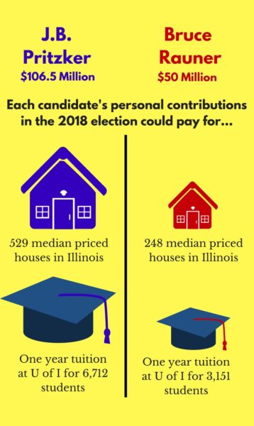 The average in-state annual tuition at the University of Illinois at Champaign is $15,868. Pritzker’s $106.5 million campaign contribution could pay the annual tuition of 6,712 students, and Rauner’s $50 million in self-funds could pay for 3,151 students to attend Illinois’ flag-ship university.