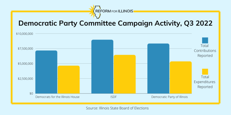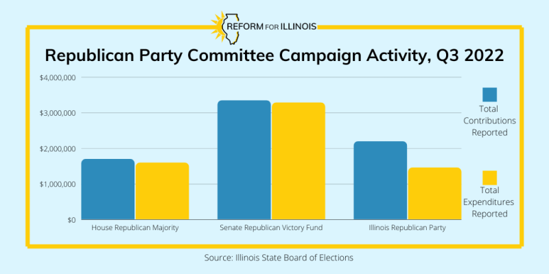 The Illinois Republican Party had the second highest fundraising haul among Republican party committees this quarter, coming in at $2.1 million. Transfers from the House Republican Majority and the Senate Republican Victory Fund accounted for $1.4 million of that total. Darren Bailey’s candidate committee, Bailey for Illinois, was the committee’s next largest contributor this quarter ($150K). The Illinois Republican Party spent $1.4 million during the third quarter, and its two largest reported expenses were for mailing and printing for DuPage County Chair candidate Greg Hart ($75K) and for mail and postage fees for Darren Bailey ($74K, in-kind). The Illinois Republican Party has the highest available cash on hand (again compared to the other two Republican party committees) at $4.2 million.
