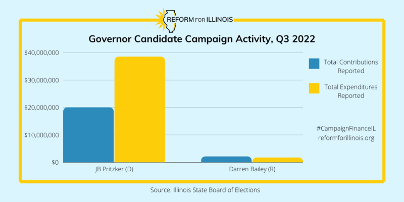Gov. Pritzker maintained his runaway lead in the money race for governor, reporting a $20 million contribution of personal funds to his campaign account in the third quarter of 2022. Pritzker’s financial advantage in the governor’s race is nothing new: the billionaire governor is his campaign’s largest donor, and his wealth has flooded the field for the past few quarters. Just $4,489.91 (or 0.02%) of Pritzker’s total fundraising came from other sources this quarter. Just 0.16% of that $4,489.91 came from small-dollar contributions of up to $150.
