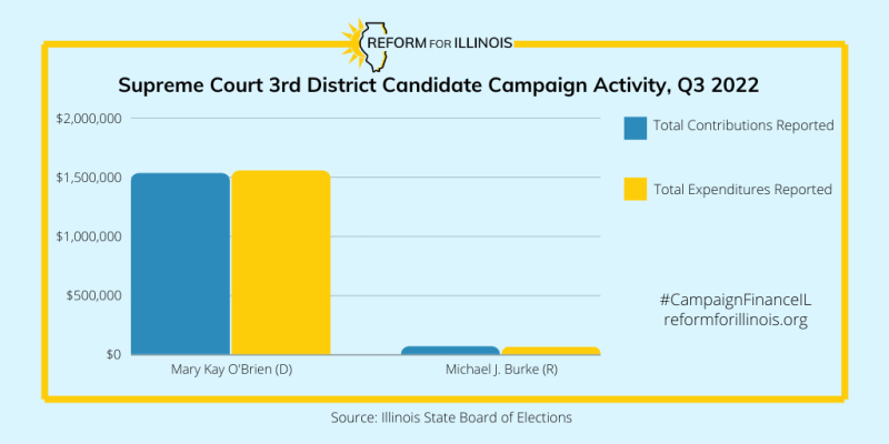 In the 3rd District, Justice Mary Kay O’Brien (D) raised an impressive $1.5 million during the third quarter, more than five times her second quarter total. Much like Judge Rochford in the 2nd District, O’Brien’s largest contribution this quarter was a $500K transfer from Gov. Pritzker. (Justice Burke self-funded back in April, meaning that contribution caps were raised to $500K in this race.) Her next largest contributions were $100K transfers from the Illinois Federation of Teachers COPE and I.P.A.C.E. O’Brien has another similarity with her counterpart in the 2nd District: her campaign received eleven $12K donations from law firms this quarter, including The Cates Law Firm LLC and the Law Offices of Parente & Norem PC. O’Brien was also the recipient of a $62K in-kind contribution for voter ID calling (to gauge the partisanship of voters in the 3rd District) from Personal PAC, in yet another similarity with Judge Rochford.