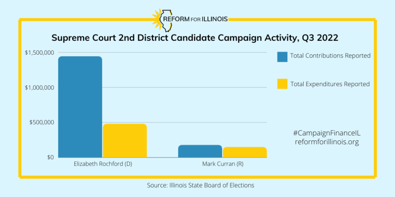 Mark Curran (R) dramatically increased his fundraising this quarter, though his reported $176K is no match for his Democratic opponent. About 56% of Curran’s total fundraising this quarter is from a $100K loan from Irene Curran, Curran’s wife. Curran filed a self-funding disclosure in late August, which raised contribution limits in the 2nd District race to $500K. (Due to a new Illinois law, self-funding judicial candidates are restricted to contributions of $500K or less from a single source, excluding the candidate and their immediate family.) As we covered in our second quarter report, the 2nd District race saw contribution limits reinstated in late June after Judge Shanes’ primary loss.