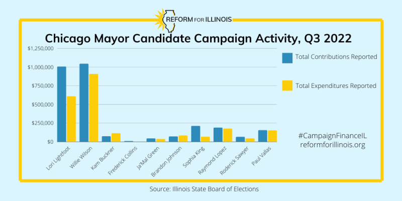 Wilson reported $906K in expenditures during the third quarter, and his highest spending category was for television, radio, and newspaper advertising ($389K). This is especially notable given that Lightfoot did not air any radio or television advertisements during the third quarter. A notable Wilson expenditure went to RRB Strategies LLC for consulting ($10K), which is run by disgraced former governor Rod Blagojevich. Wilson has $4.6 million available to spend.