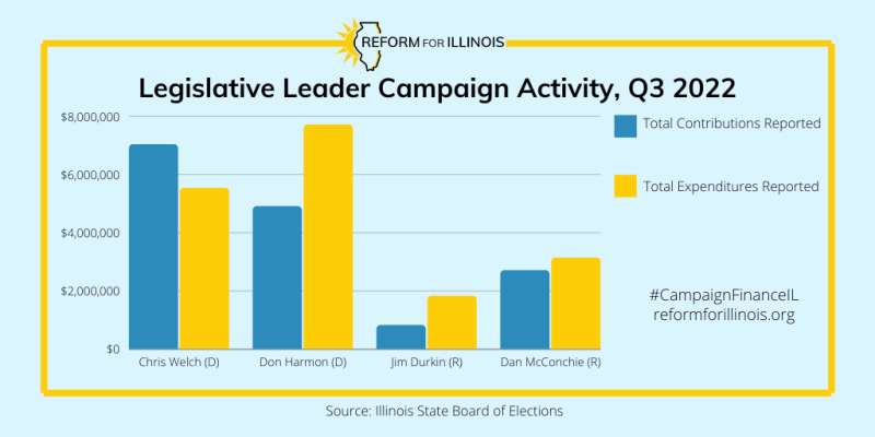 A huge wave of money has been hitting Illinois’ legislative leaders’ campaign accounts in advance of November 8th. Illinois House Speaker Chris Welch and Illinois Senate President Don Harmon bested their Republican counterparts, Leaders Jim Durkin and Dan McConchie, in the money race again this quarter. Welch raised 8.5 times Durkin’s haul, while Harmon raised 1.8 times McConchie’s. Welch raised more than Harmon this quarter, in a reversal from the second quarter of 2022.
