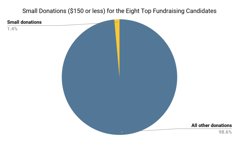 By the end of 2018, a total of $12.2 million had been raised by those eight candidates. We found that donations of $150 or less added up to just $175,682.36, or 1.4%, of the total.