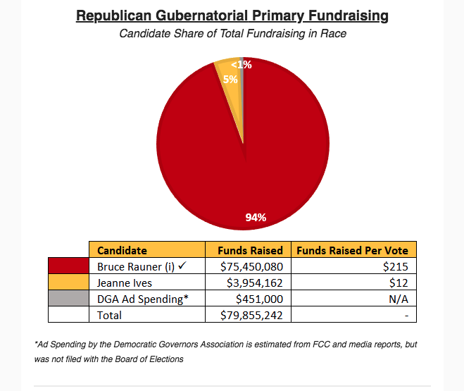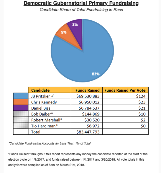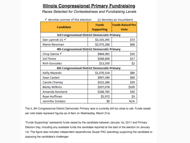 In the Governor’s race, victor JB Pritzker (D) raised $124 per vote, and Gov. Bruce Rauner (R) raised an astonishing $215 per vote. In contrast, GOP challenger Jeanne Ives raised just $12 per vote, and received about 48% of the overall vote share in the Republican Primary race.