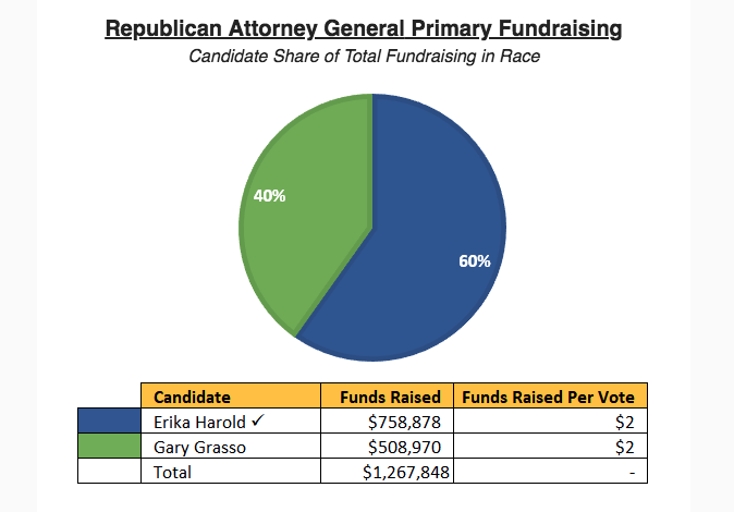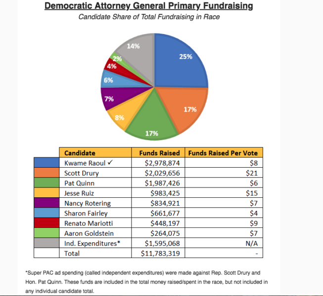 Amounts raised by winners of the Attorney General race paled in comparison, with Sen. Kwame Raoul (D) raising $8 per vote, and Erika Harold (R) raising just $2 per vote. Democratic Challenger Scott Drury raised the highest ratio in that race with $21 per vote. This was mostly due to a $1 million contribution he received from private funder Steven Miller.