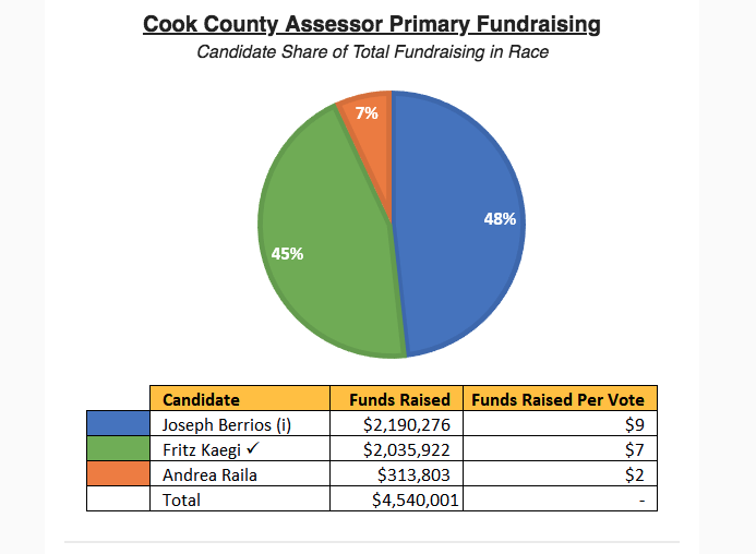 Other surprise upsets included self-funded candidate Fritz Kaegi declaring victory over Cook County Democratic Party Chair Joe Berrios in the race for Cook County Assessor. The two raised similar amounts of money, but Berrios relied heavily on property tax appeals lawyers and local party funds. In the hotly contested Illinois 3rd Congressional District, Democratic challenger Marie Newman was unable to best incumbent Dan Lipinski, even though Newman showed strong fundraising throughout the campaign. The two raised $73 and $68 per vote respectively.