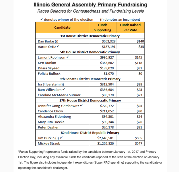 A few political newcomers pulled surprising upsets last night, showing that the most monied candidate is not always the victor. Aaron Ortiz, an educator, defeated Dan Burke, a 27-year state legislator and brother of prominent Chicago Alderman Ed Burke, to earn the Democratic nomination in the 1st State House district. Ortiz raised just $35 per vote to Burke’s $140. In the 8th State Senate District, Ram Villivalam defeated embattled State Senator Ira Silverstein for the Democratic nomination. While Silverstein had Senate establishment support, Villivalam still raised $25 per vote to Silverstein’s $38.
