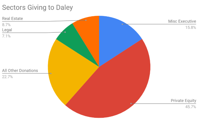 Even before Griffin’s $2 million contribution, nearly half of Daley’s funds came from finance firms and their executives. Other significant donors include real estate and legal interests as well as corporate executives from industries that don’t fit into those major sectors.